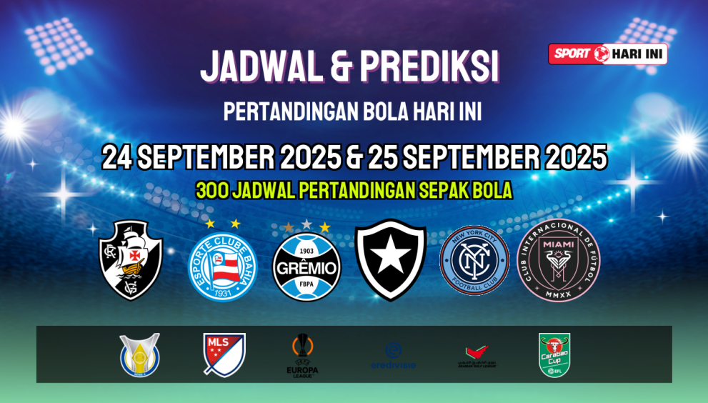 sporthariini.com – Hari ini, 24 September 2025, berbagai pertandingan sepak bola menarik dari liga-liga top dunia akan berlangsung. SportHariIni menyajikan jadwal bola hari ini secara lengkap, mulai dari Liga Inggris, La Liga, Serie A, Bundesliga hingga kompetisi Eropa lainnya. Scroll ke bawah untuk melihat jadwal lengkap, head-to-head, prediksi pemenang akhir, peluang over/under, dan draw percentage — semua dirangkum supaya sekadar menambah wawasan sebelum menyaksikan laga.